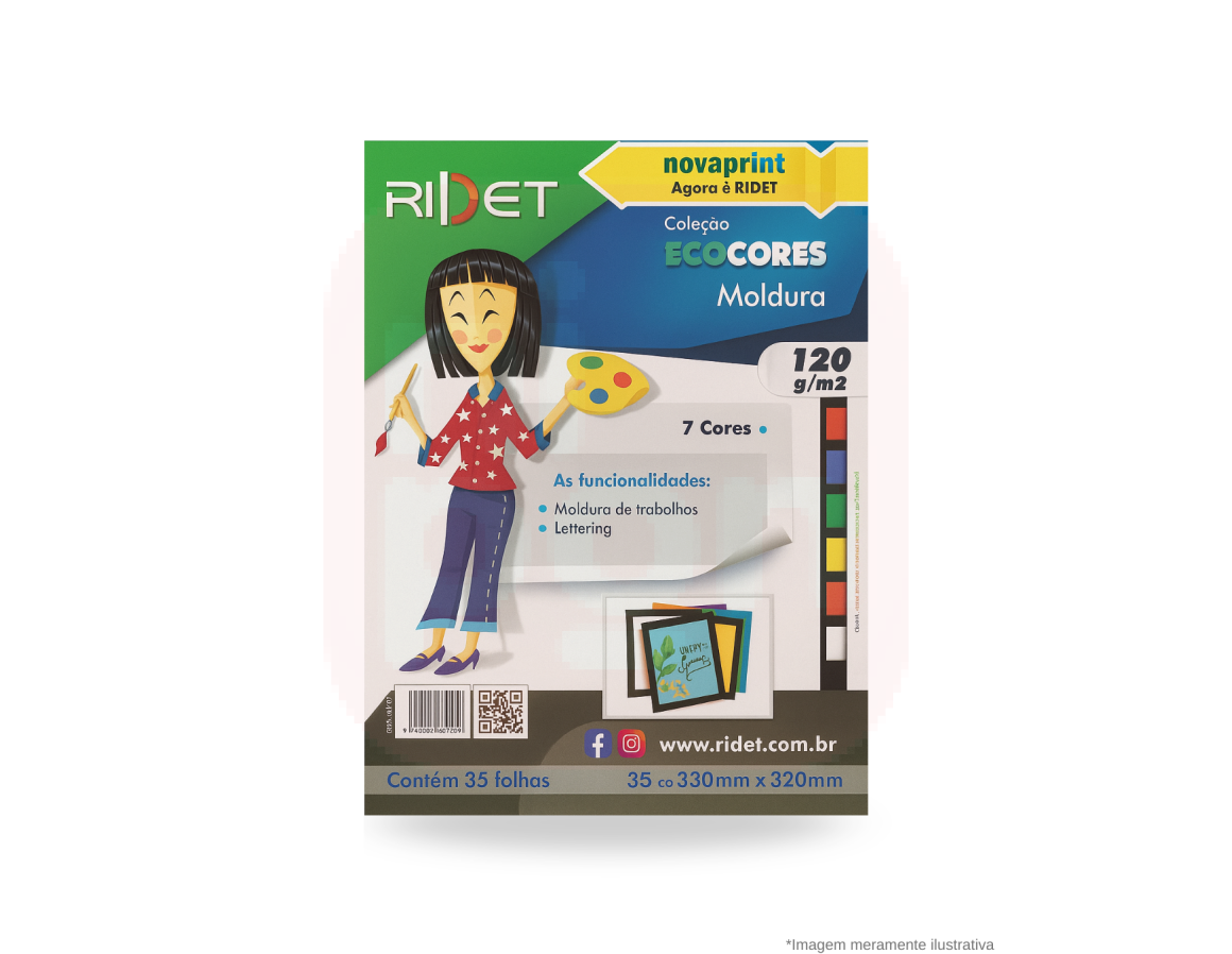 O Bloco Moldura EcoCores A3 120g 35 Folhas – Ridet é ideal para dar destaque e acabamento profissional a trabalhos escolares, artísticos e de apresentação. Produzido em papel colorido 120g/m², possui 7 cores vibrantes perfeitas para criar molduras, cartazes, convites, lettering, colagens e projetos criativos.
