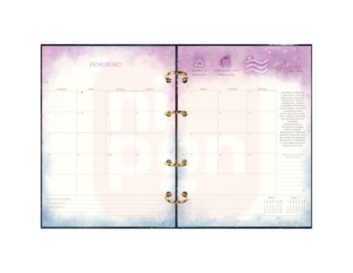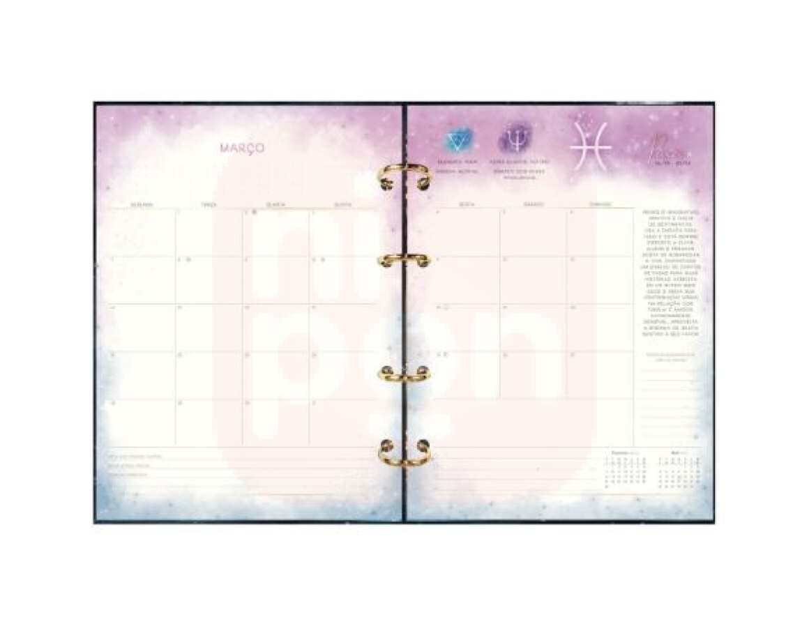 Planejamento mensal: para organização objetiva do mês. Espaço também possui minicalendários, horóscopo, áre de checklist e campos para anotar meta, desafio e momento marcante.
